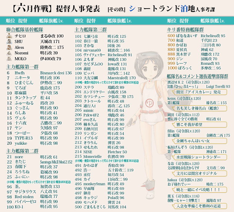 背景はNaoYumii。彼が人事をHonoluluにするということで、人事をHonoluluで揃えようという話をしていたのですが、寝落ちして別の艦になってしまいました。