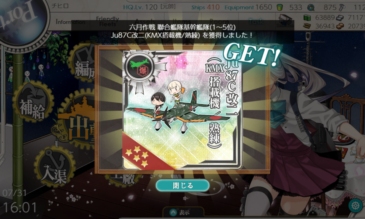 新実装の銀河江草に加え、ランカー周回で重宝する蛟龍もいただきました。まだまだ弱小鎮守府でしたので、射程長艦爆のKMX熟練も非常にありがたい装備でした。この月の聯合は大当たりでした。