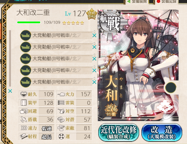 この月の聯合限定報酬はキ乙☆3。短足銀河江草ですね。短足ですが出撃できれば絶大な威力を発揮します。他にも大和改二実装関連の装備が並べられ、熟練測距儀、15.5副砲改☆10、瑞雲改二と豪華なラインナップでした。