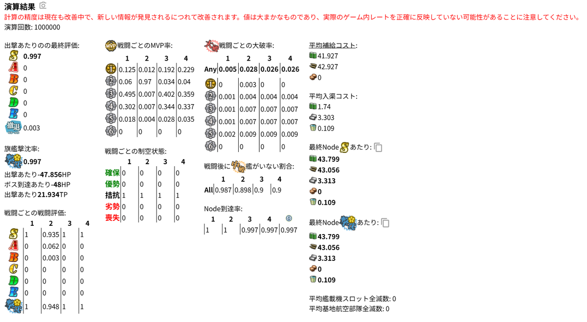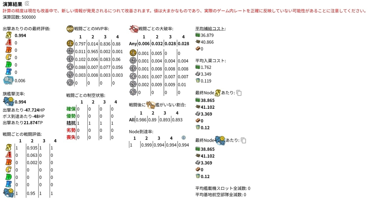 4番艦のMVP率がかなり低く出ています。おそらく設定か何かがおかしいです。実際時雨を旗艦にしたことあまりないので、1周1.1以上は取っているとみて間違いないです。