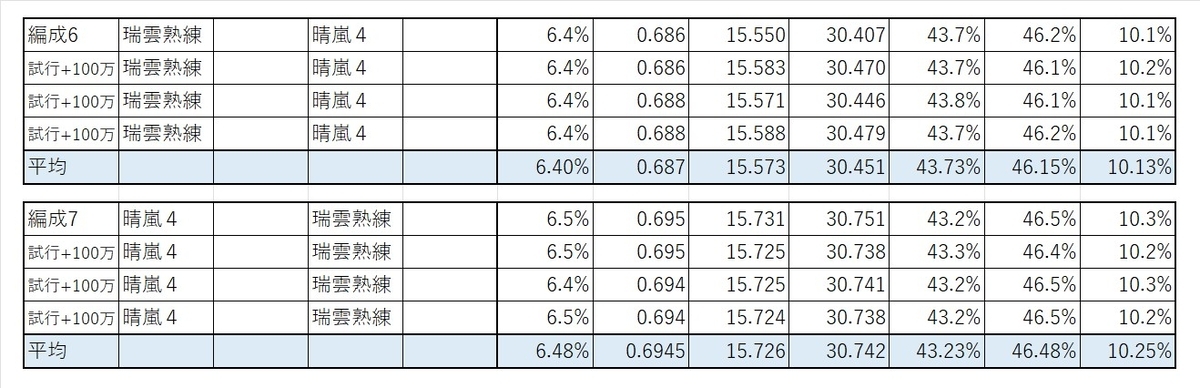 なお、1スロットに水爆を積まない編成5が異様に成績が良かったことは想像していませんでしたが、以下の編成6,7の再試行を含めてみて、誤差が出るほどではなさそうなので信用して大丈夫そうです。最高の成績を出した編成6と、編成7についてはここまで差が出ると思っていなかったため、プラスで300万回シミュレーションを回しました。