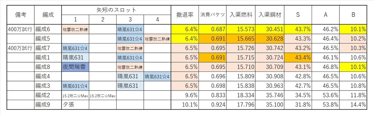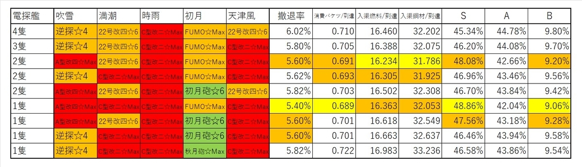 矢矧が被弾したまま出撃する分、わずかに撤退率が上がります。編成間の比較では概ね先ほどと変わりません。