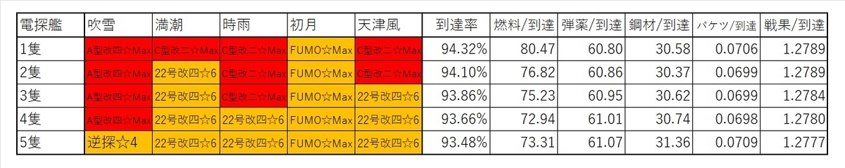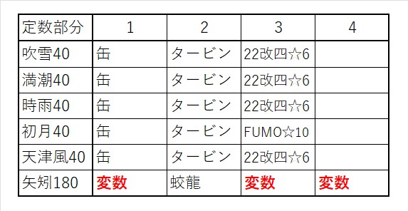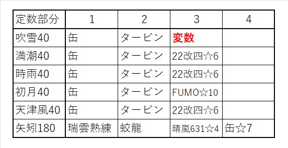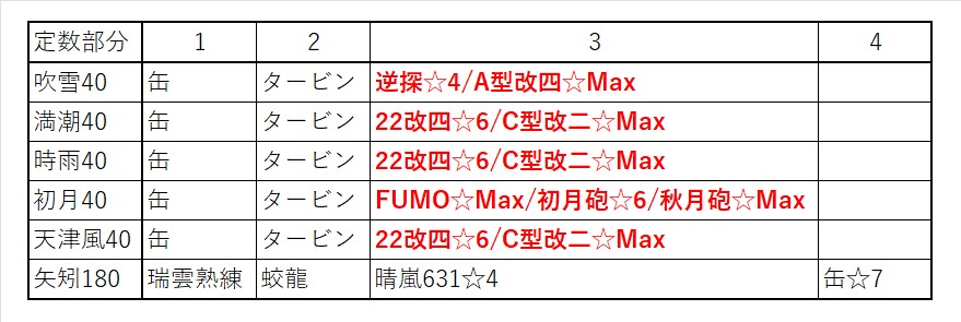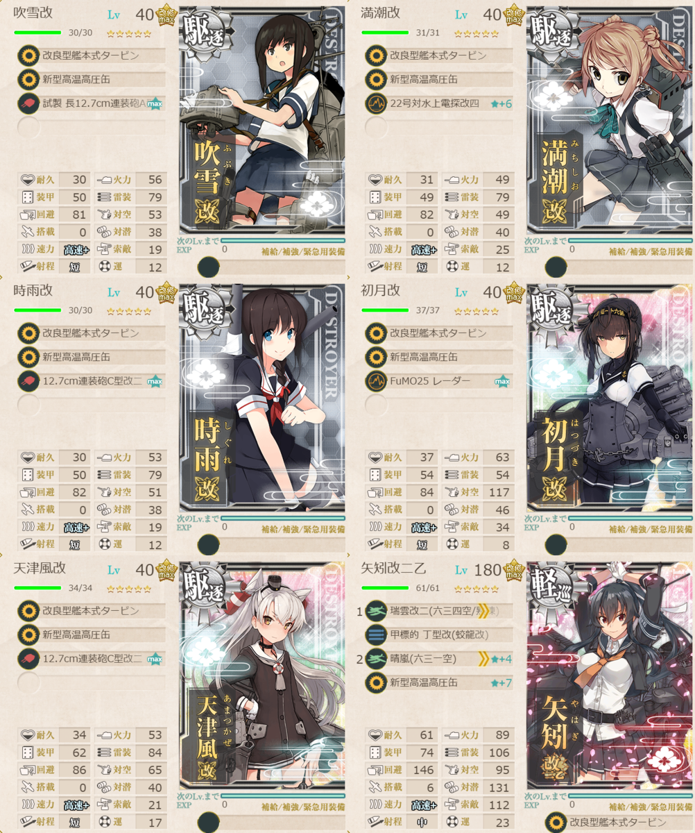 ・使用する編成は吹雪改、満潮改、時雨改、初月改、天津風改、矢矧改二乙として、駆逐艦はLv40、軽巡はLv180キラありとする。軽巡の缶のみ、☆7を使用し、耐久改修済みとする。艦載機熟練度はMax。