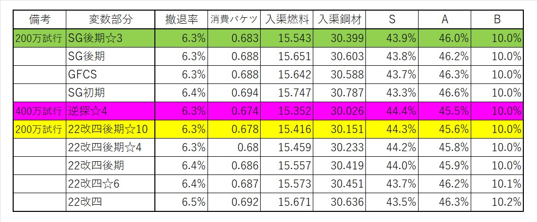 編成6,7の+300万回の試行結果です。ある意味、このシミュの誤差検証の側面もあるでしょう。撤退率は誤差ではほぼ動かず、バケツに関しても編成5,6,7間ではっきりとした差が出ていることを示唆する結果であると言えそうです。