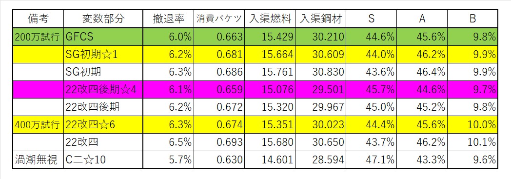 撤退率ではGFCSが、被弾では22号改四後期☆4が強かったですが、リスクヘッジからできる限り随伴では使いたくありません。使用可能なラインのSG初期☆1は到達率に最も優れ、22号改四☆6は被弾に最も優れており、どちらも候補になるという感じでしょうか。