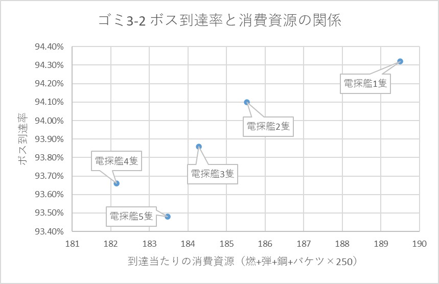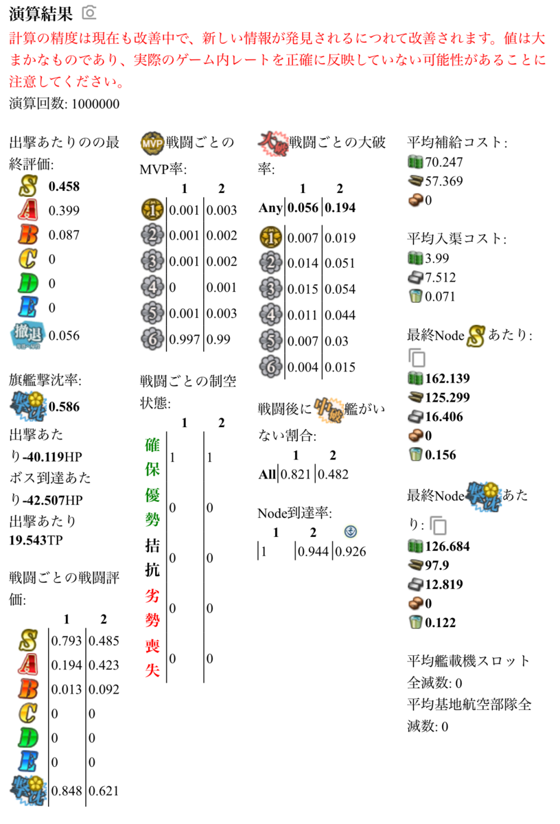 このことから、ゴミ3-2編成のサンプル編成における最適解は、次の2編成が有効なのではないかと推測できます。電探艦の数の条件を変えて、その中での最適解でシミュをかけてみることとします。