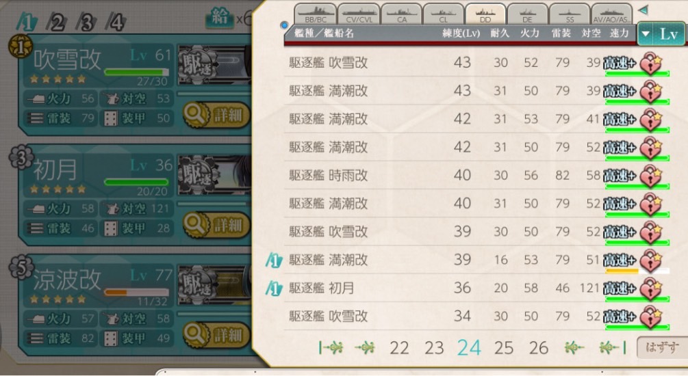 そして、修理している間に、あるいは疲労がたまったら別の高速+の同装備の艦を見つけて交換して出撃します。大量の高速+の控えを作っておき、疲労、被弾でローテーションするわけです。自分はここに牧場を兼ねているので、吹雪満潮がスタメンで、あとは育成枠の初月時雨綾波であったり、優先度の低い牧場である初雪などで回しています。